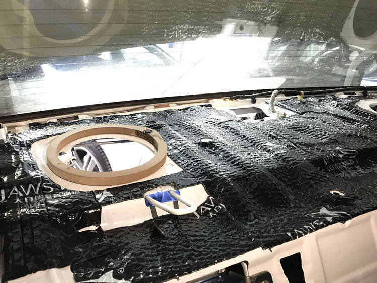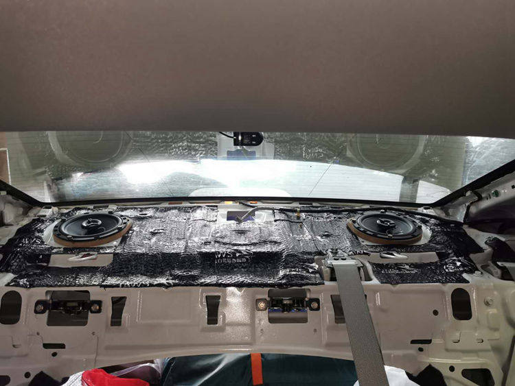 3、后挡板进行隔音处理,避免钣金产生鼓皮共鸣现象;让后加装喇叭支架固定后声场的诗蔓同轴喇叭。