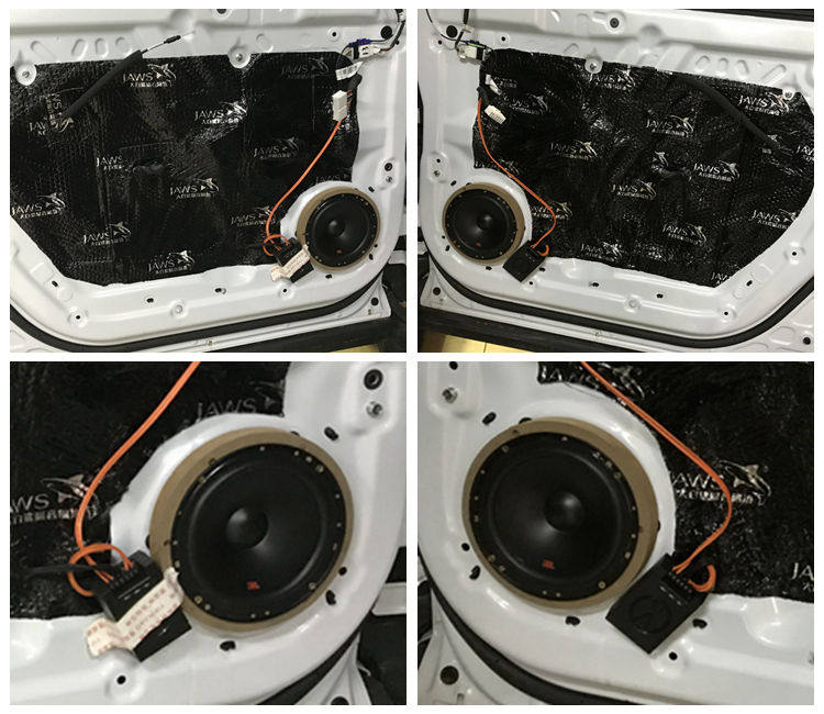 4、车门隔音之后对位安装前后声场喇叭,这是前门的美国JBL 604C二分频喇叭,高音和中低音都是对位安装。