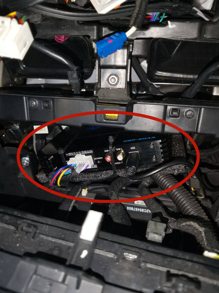 5、这是魔立方DSP功放安装的位置,主机后面的空腔部位固定就可以了;无损升级,不改线、线束和主机对插即可。