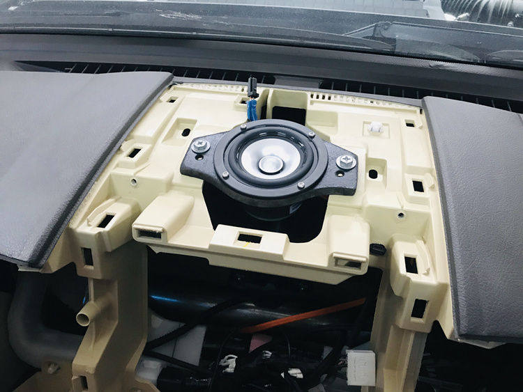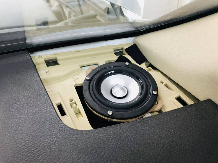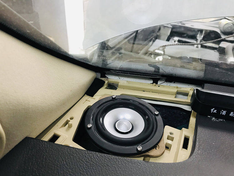 前声场的魔立方三分频中音单元安装位置,仪表台上靠近A柱位置安装,对位升级,声音更纯正人声甜润悦耳。