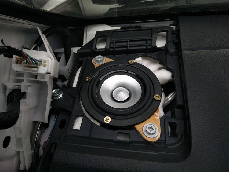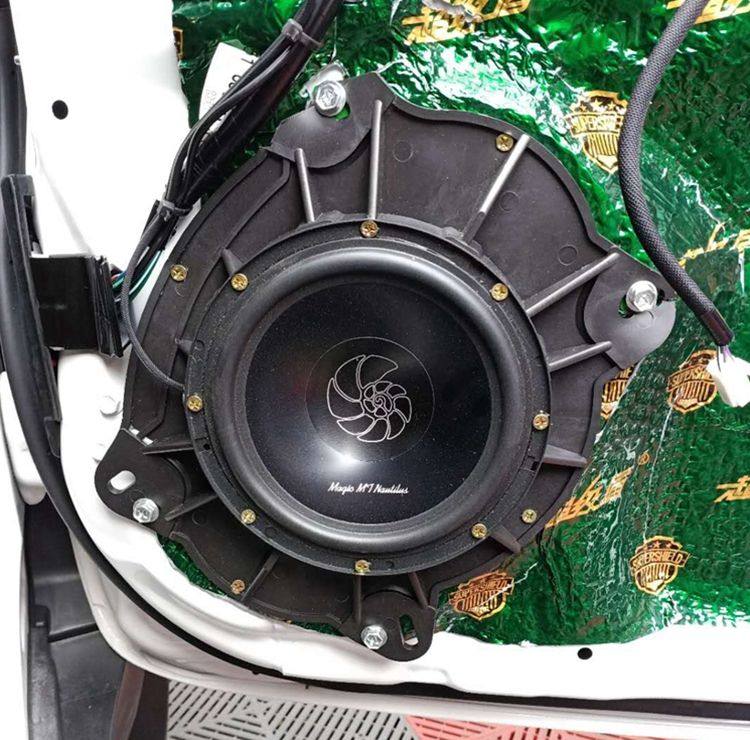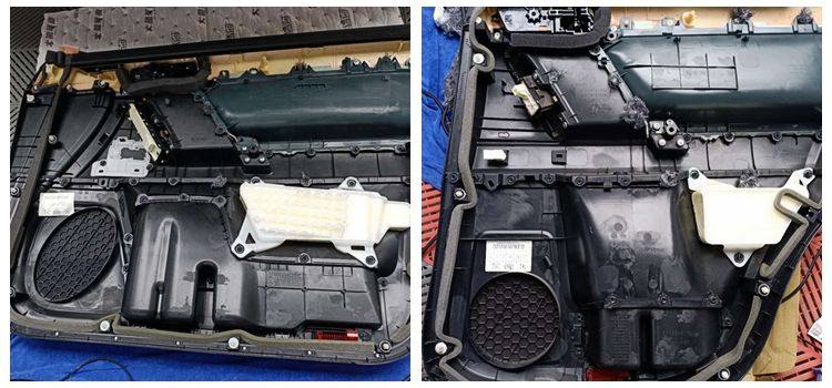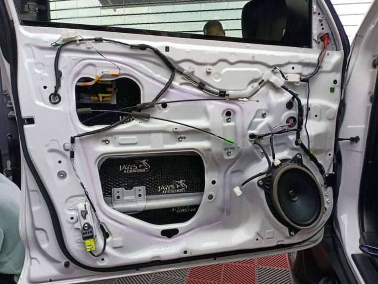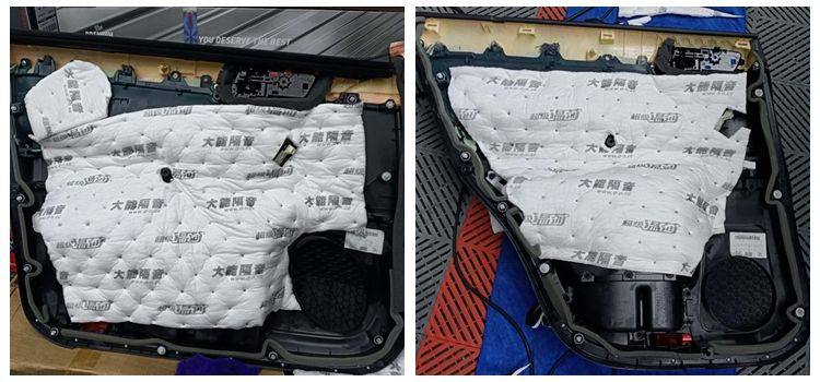 车门钣金的双层隔音处理,粘贴大能超级盾止振材料,车门钣金共鸣噪音和风噪得到有效解决;车门隔音之后,如同一个密封的箱体,有利于提升喇叭的音质效果。