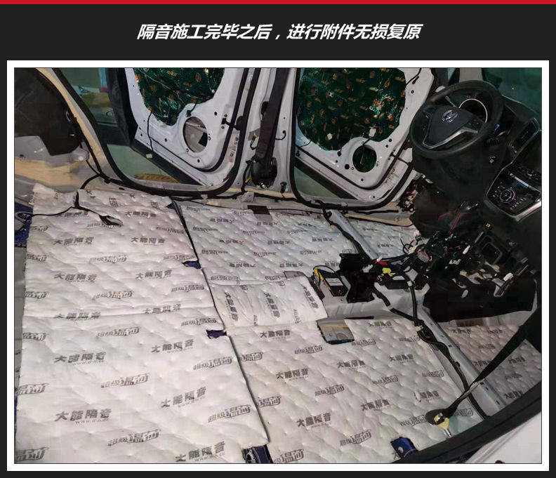 长安CS75汽车隔音降噪解决方案: 车门隔音:2层大能隔音止振处理 坐舱底板:1层大能蓝金刚止振+1层大能吸音棉 尾箱:1层大能蓝金刚止振+1层大能吸音棉 隔音施工:重庆正信汽车音响隔音改装 店家地址:重庆市江北区嘉鸿大道299号附6号 联系方式:18908368619 陈老师(总部) 方案解析: 首先把长安CS75坐舱底板的原车阻尼隔音材料清除干净,从而起到消除车内异味的作用。 针对车门、坐舱底板、尾箱这些部位进行隔音止振处理,有效解决风噪、路噪和低频共鸣噪音,从而让爱车的驾乘环境更安静舒适。 1、车门隔音处理: