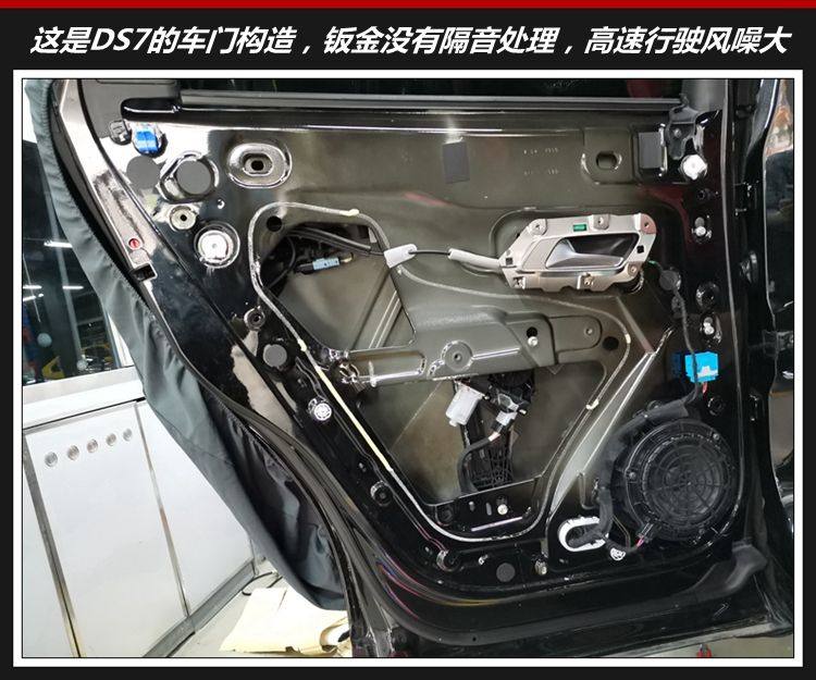 DS7汽车隔音降噪解决方案: 四门三层隔音:大能蓝金刚+大能超级温莎 四轮:大能蓝金刚+大能超级温莎 引擎盖:大能蓝金刚+大能银卫士 隔音店家:重庆正信汽车音响改装 1.车门隔音降噪处理,主要解决风噪问题: