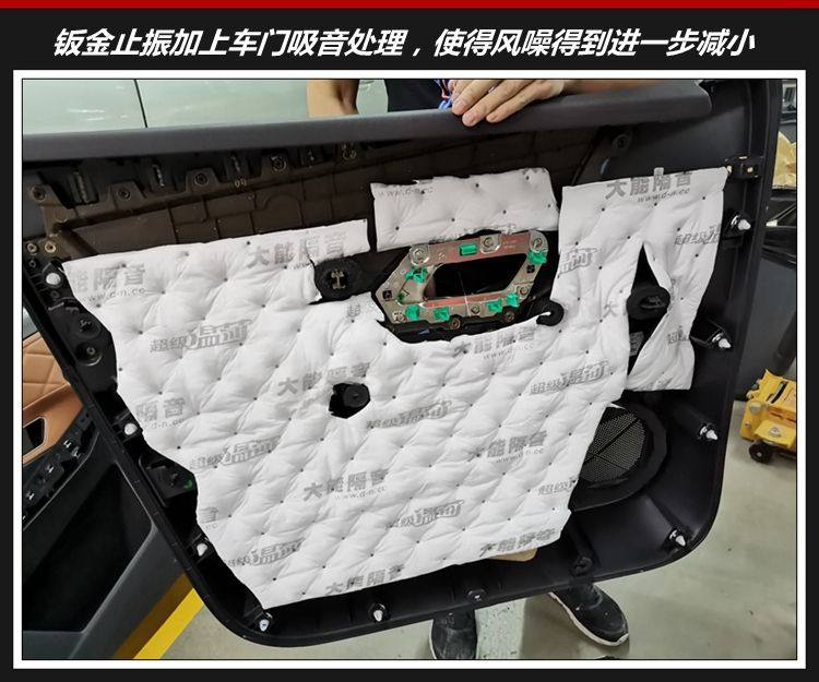 车门钣金双层隔音处理,门皮粘贴一层吸音棉,三层隔音之后风噪问题得到解决。