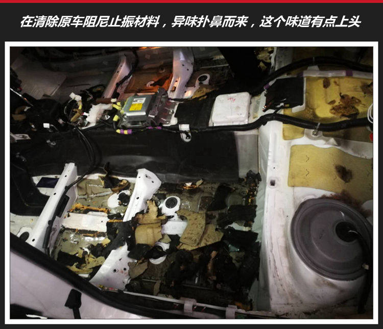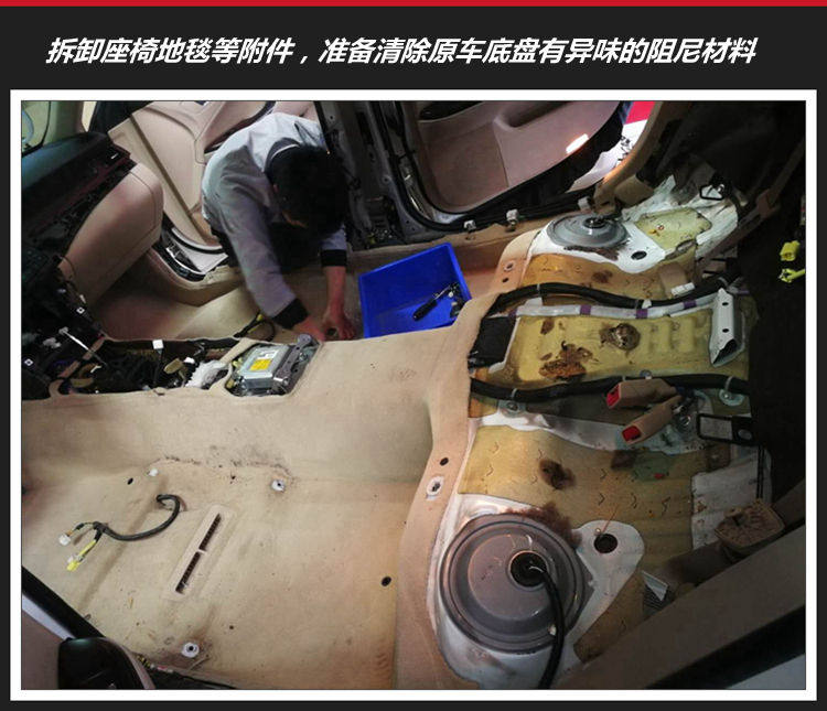 车型:10款丰田皇冠 底盘隔音:大能蓝金刚+大能低频王 尾箱隔音:大能蓝金刚+大能超级温莎 其他:地板+后备箱原车阻尼片清除 隔音店家:重庆正信汽车音响改装 方案解析: 丰田皇冠原车底盘、尾箱上的阻尼隔音材料是异味的产生源头,想要去除异味,就必须先把原车阻尼材料清除干净。之后再粘贴大能环保隔音止振和吸音材料,解决丰田皇冠的底盘路噪、共鸣噪音和尾箱的风噪问题。 1、重庆正信汽车音响店的师傅们正在拆卸座椅地毯等附件,准备清除原车有异味的隔音材料: