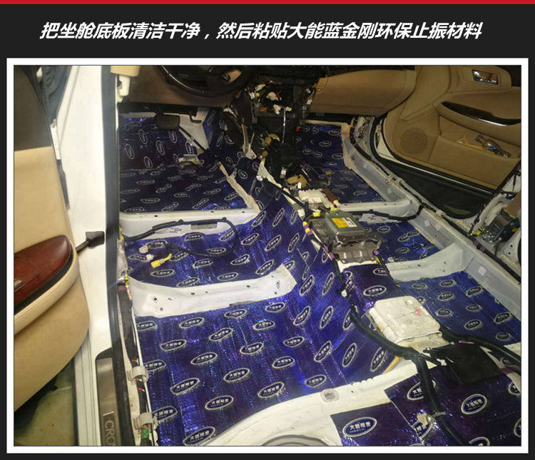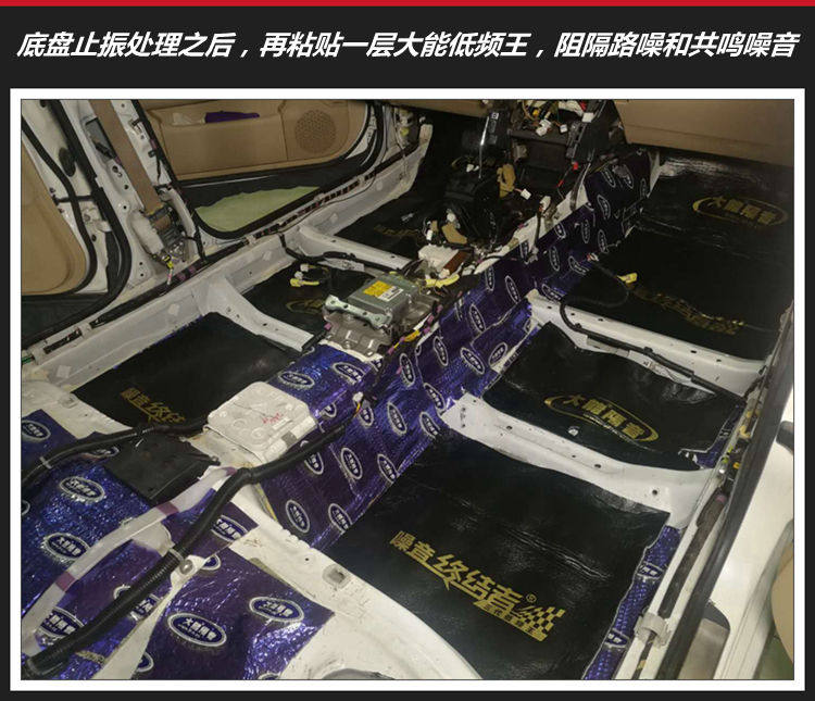 底盘第二层隔音处理,粘贴大能低频王隔音材料,它是低频共鸣噪音的克星,高效解决座驾的路噪问题。