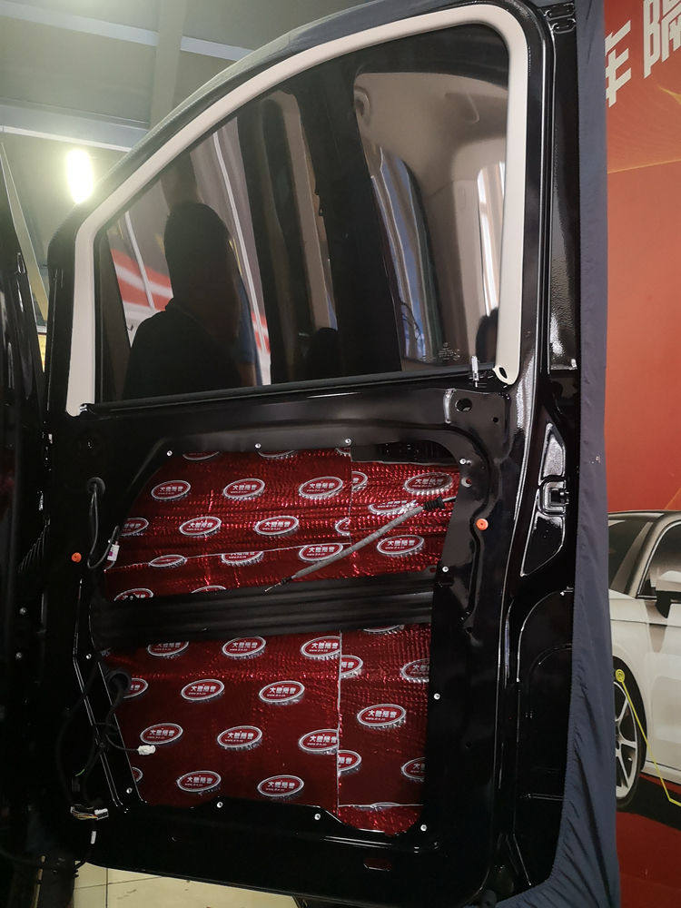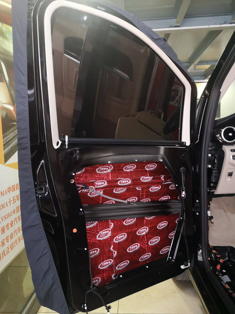 1、首先是车门的隔音降噪处理,这是奔驰V260前门里层钣金的隔音止振处理,粘贴大能红派隔音材料、提升钣金扎实度、阻隔共振共鸣噪音入侵。