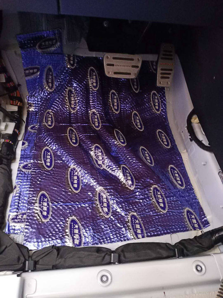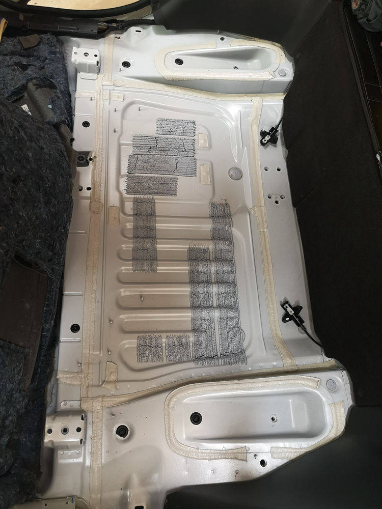这是底盘的第二层隔音处理,粘贴大能低频王,让是低频共鸣噪音的克星,隔音效果持久高效。