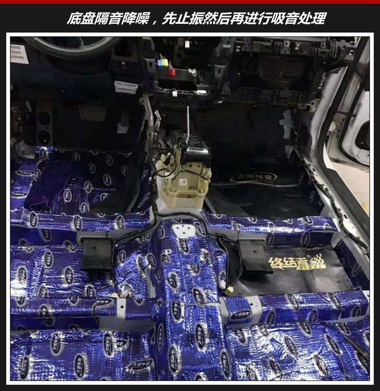 2、底盘隔音降噪处理,首先进行钣金止振,消除低频共鸣噪音和路噪。 底盘为双层隔音,先粘贴大能低频王,它是低频路噪的克星。