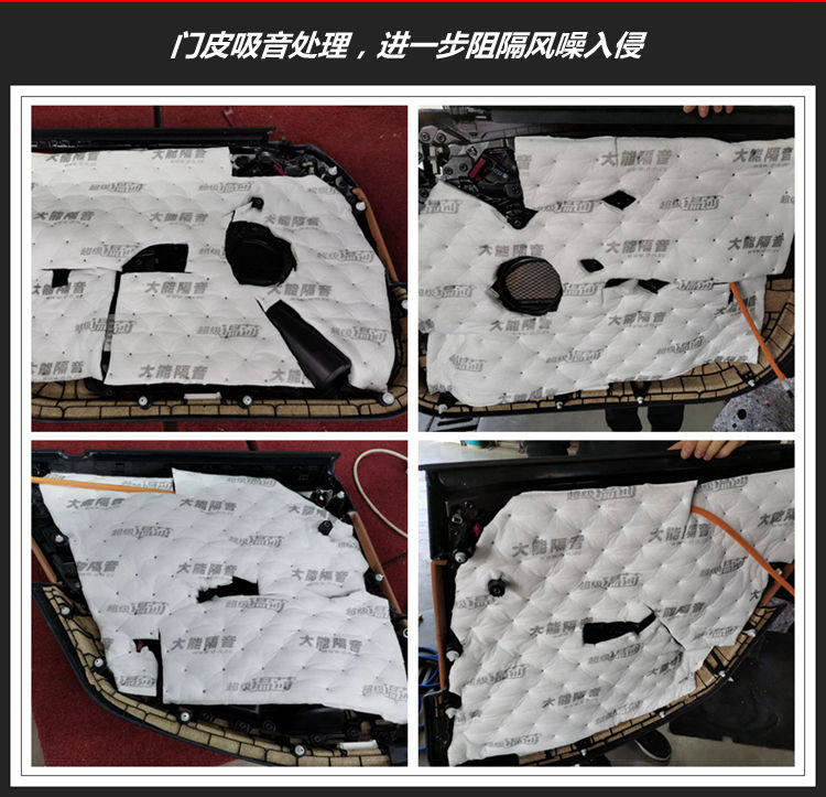 车门钣金粘贴大能隔音止振材料之后,再粘贴大能吸音棉;深度隔音使得车门钣金变得更扎实、避免钣金产生共鸣现象;隔音之后车门密封,减小风噪。