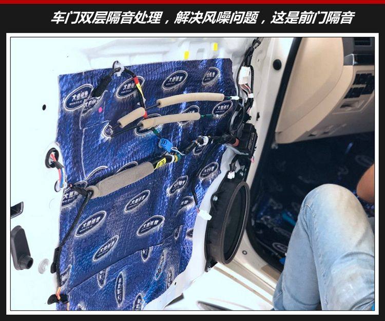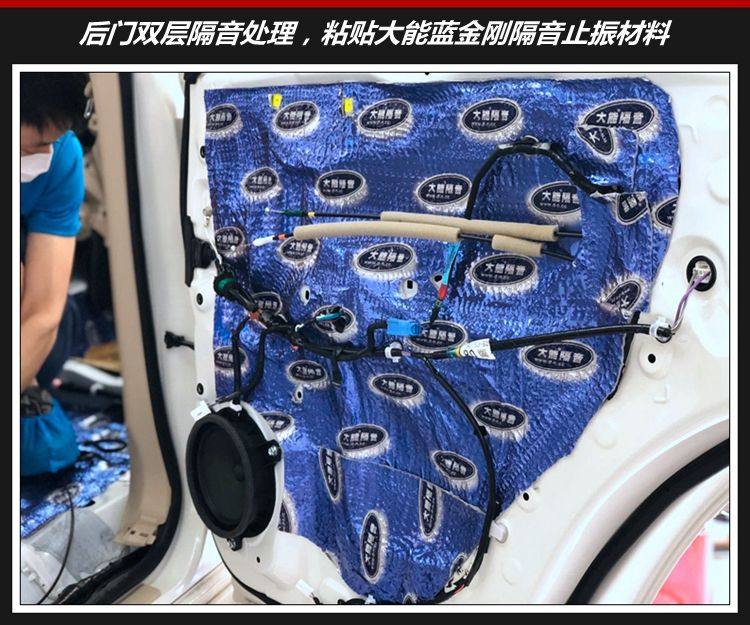 1、首先来看看车门隔音降噪升级,车门钣金双层隔音降噪处理,粘贴大能蓝金刚隔音止振材料,可以强化车门钣金、阻隔风噪入侵。