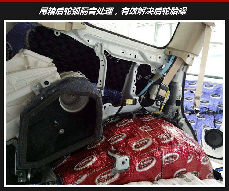 3、再来看看尾箱和后轮弧的止振和吸音处理,粘贴大能红派隔音材料,阻隔后轮胎噪入侵。