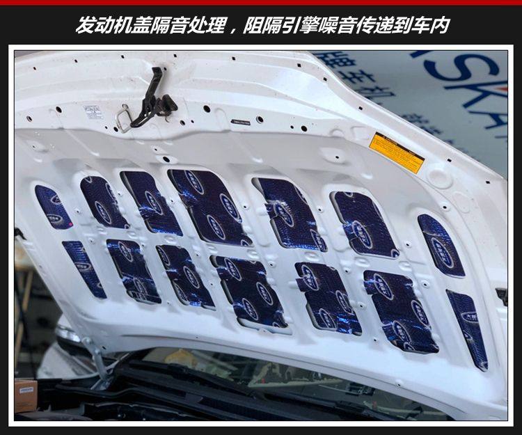 5、引擎盖隔音降噪处理,大能蓝金刚隔音材料+大能引擎盖覆膜,双层隔音有效减小发动机噪音传递到车内。