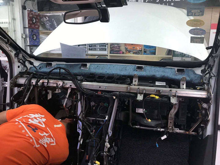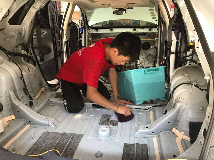 1、首先拆卸仪表台附件、座椅、地毯等,准备把原车有异味的原车阻尼隔音材料、棉絮清除干净;重庆正信的师傅正在拆卸附件。