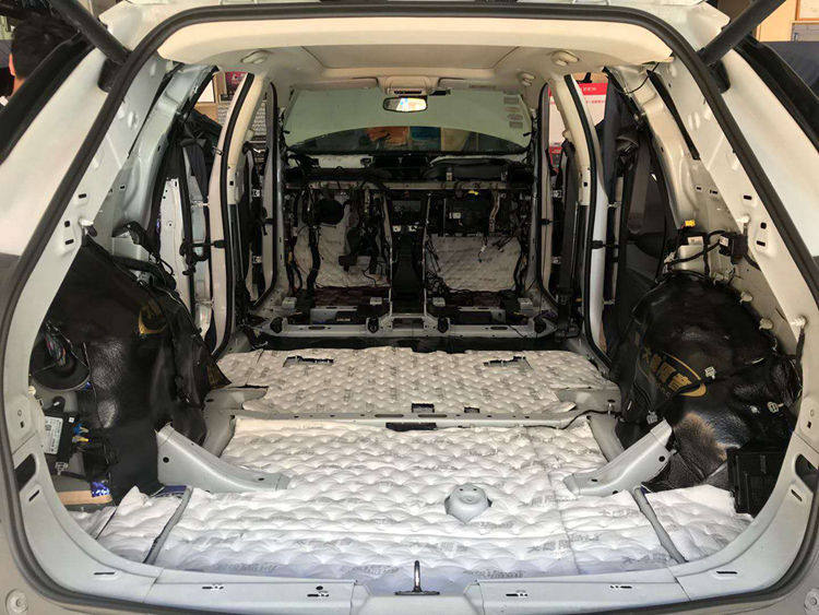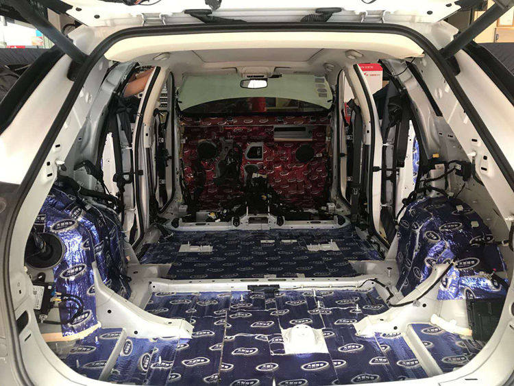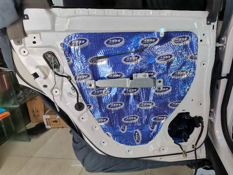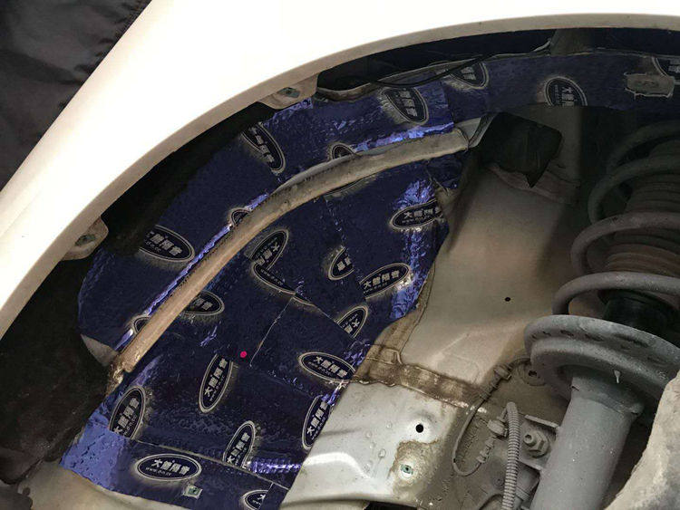底盘钣金、尾箱和后轮弧等部位粘贴大能蓝金刚隔音止振材料,有效阻隔路噪、尾箱共鸣噪音和后轮胎噪入侵。