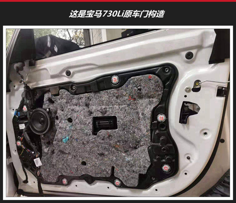 2、宝马730Li车门构造,原车喇叭比较普通,车门上隔音设施也比较少,就一层棉絮材料起到一般的吸音作用。