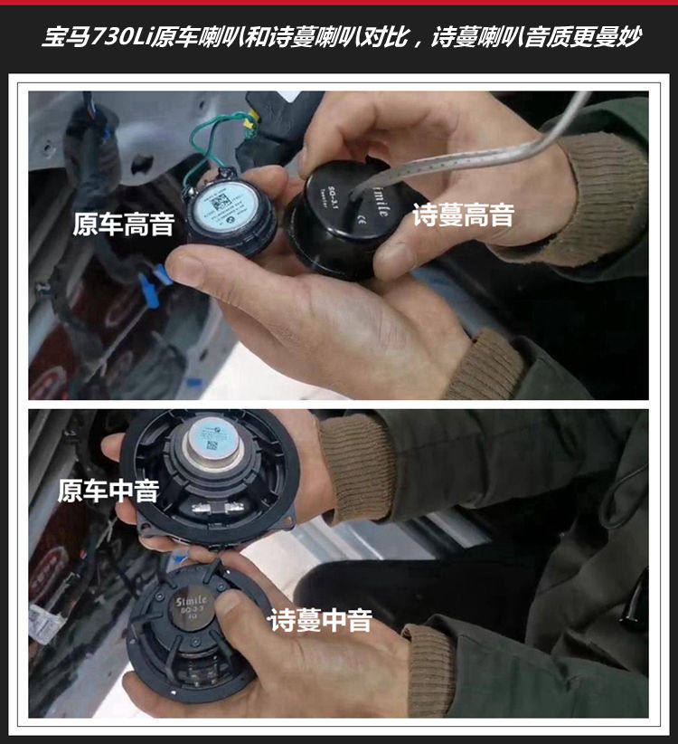 4、宝马730Li原车喇叭和诗蔓喇叭对比,诗蔓喇叭用料和做工都比较考究,音质效果更细腻传神。