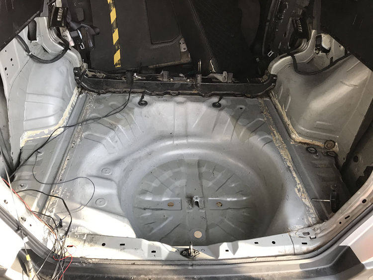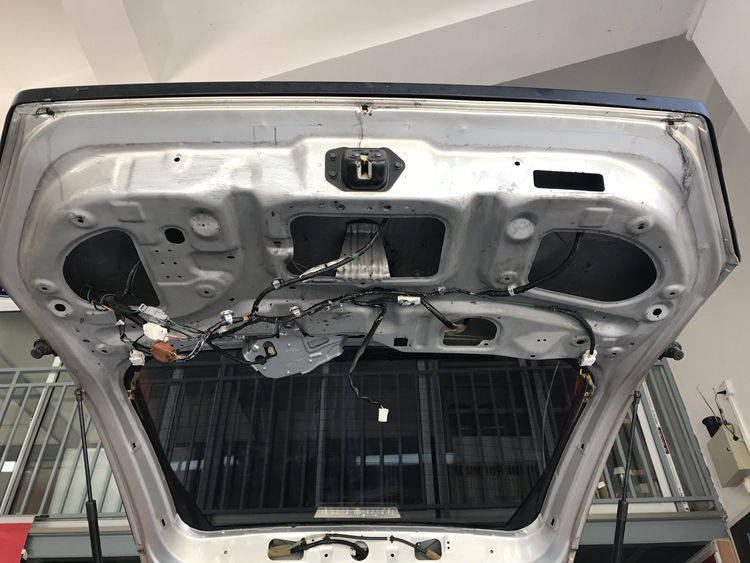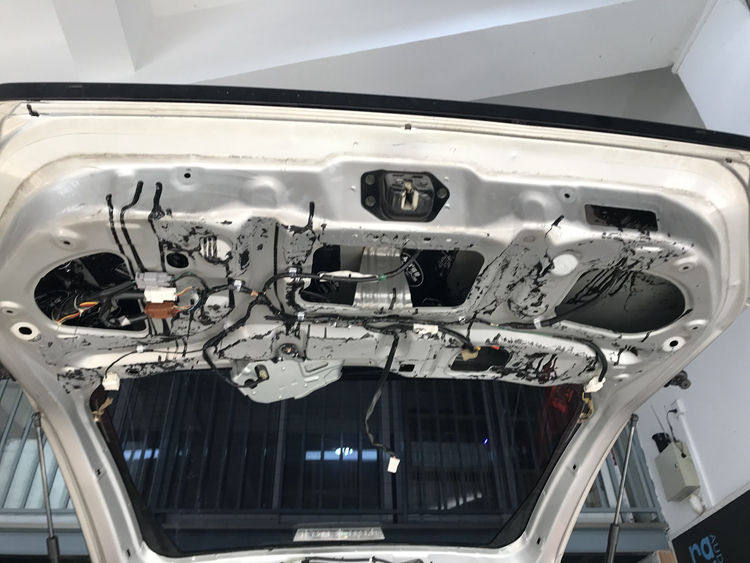 清除干净之后的尾箱盖,师傅们准备针对这些部位进行隔音,主要解决风噪入侵。