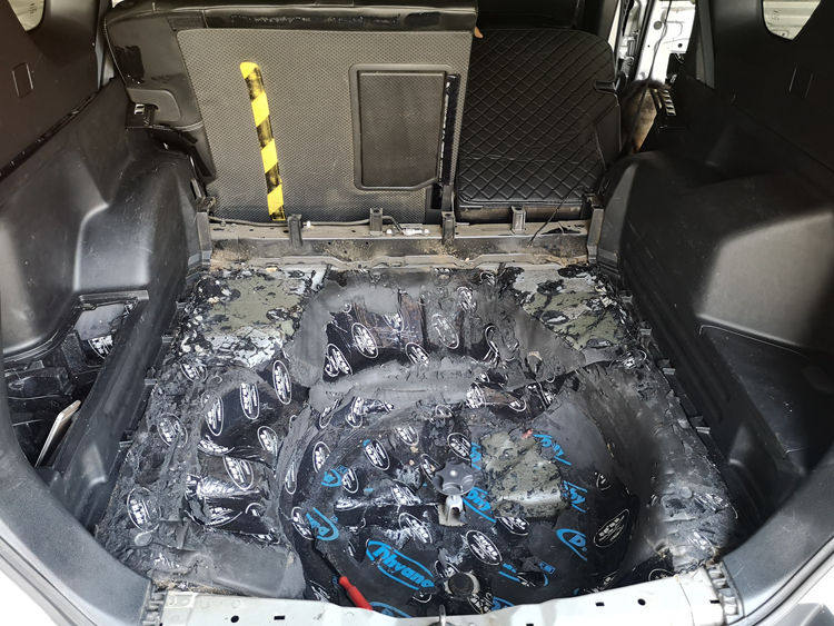 但是随着时间的推移,原先做的隔音效果越来越差,门板、尾箱粘贴的隔音材料已经开始分解融化,黏胶物质粘得哪里都是,而且异味问题突出,为此车主非常苦恼。