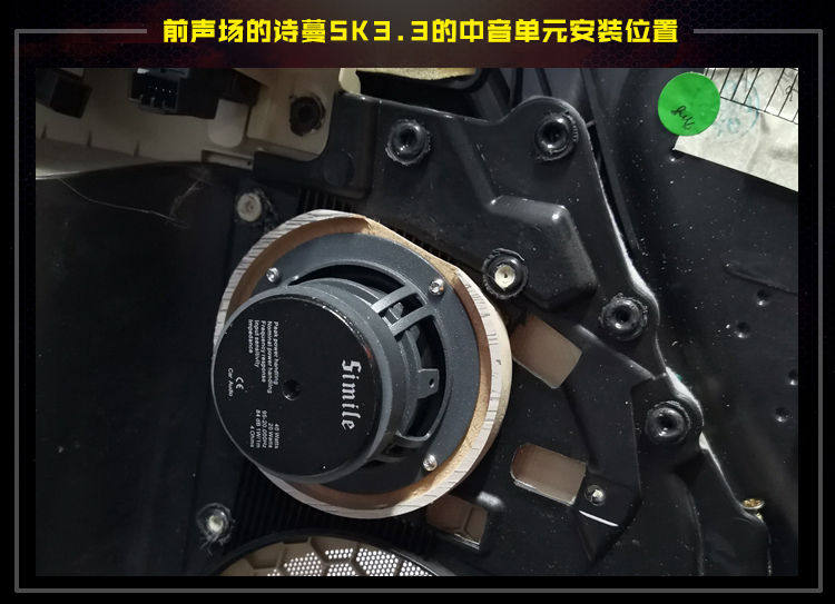 诗蔓SK3.3中音在门皮中部安装,特制喇叭支架进行固定。