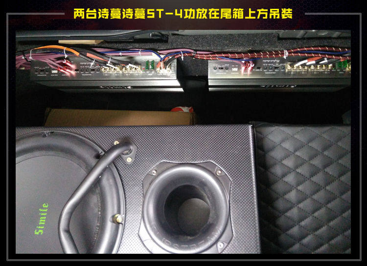 4、两台诗蔓ST-4四路功放在尾箱上方的钣金固定安装,推前声场诗蔓三分频喇叭和尾箱低音,效果非常不错。