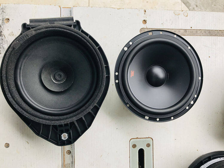 2、左边这个是迈锐宝的原车喇叭,塑料纸盘结构,磁芯小,声音不清晰;右边的是哈曼JBL,喇叭音质效果更通透饱满。