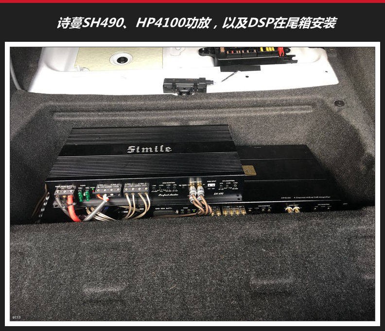 3、尾箱空腔位置安装功放和DSP,安装布局非常合理,线材处理等细节方面重庆正信汽车音响店非常用心。