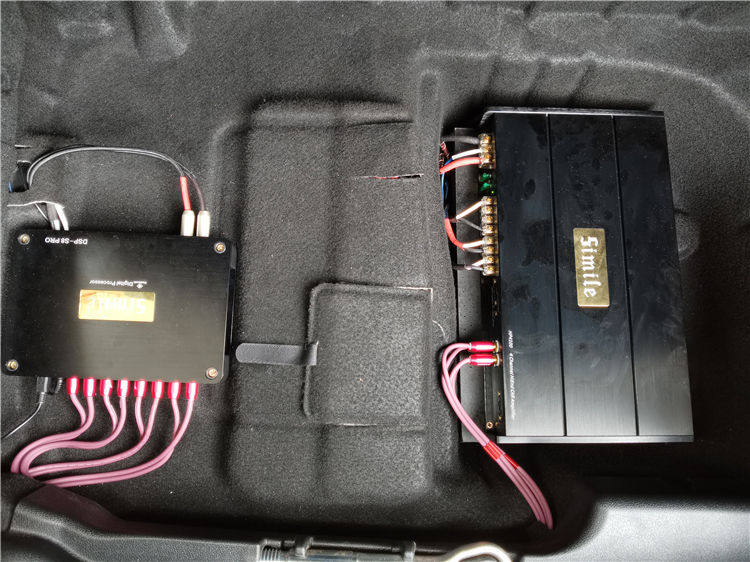 诗蔓SH480和诗蔓HP4100两台四声道功放,驱动前声场和低音炮,采用诗蔓DSP配合调节,整个声场精准。后备箱隐藏式安装,从外观上看不出来改动。