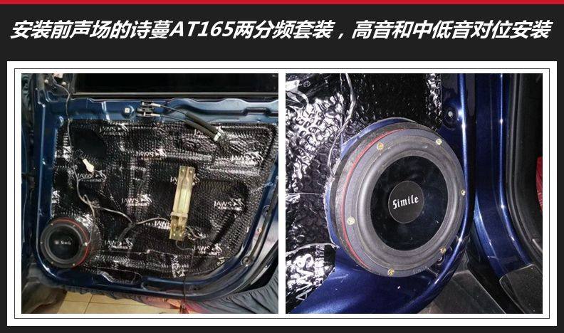 2、安装前后声场两套喇叭,前门的诗蔓AT165二分频喇叭对位安装,加装防水罩保护喇叭,喇叭线进行焊接处理。这套喇叭的高音清晰甜润,中低音通透饱满,音乐得到更真实的还原。
