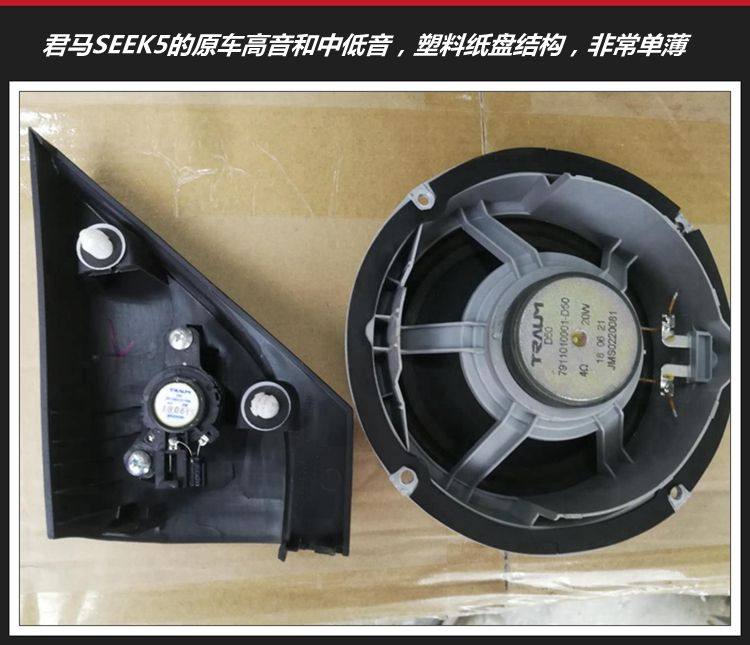 这是君马SEEK5的原车喇叭,塑料纸盘结构,高音不清晰、中低音含糊不清。