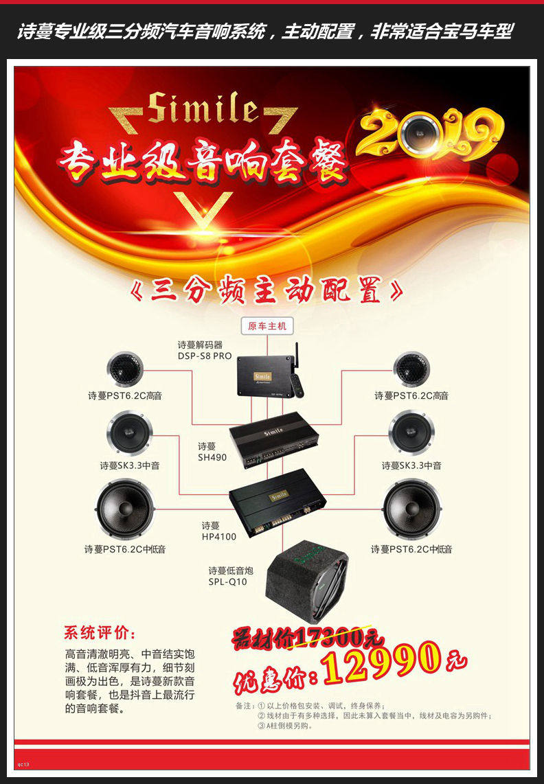 宝马5系汽车音响改装方案: 处理器:诗蔓DSP-S8 1台 前声场:诗蔓PST 6.2 1套 中音:诗蔓SK 3.3 1对 低音:诗蔓Q10 1个 前声场功放:诗蔓HP-4100 1台 低音功放:诗蔓SH-490 1台 电源系统:诗蔓12F电容 1台 电源线、音频线、喇叭线 1套 改装店家:重庆正信汽车音响隔音改装 店家地址:重庆市江北区嘉鸿大道299号附6号 联系方式:18908368619 陈老师(总部) 方案解析: 专为宝马车型量身定制高性价比诗蔓汽车音响系统: 前声场由诗蔓PST6.2C套装+诗蔓SK3.3中音构建三分频系统,两台功放主动分频推三分频喇叭,音质效果细腻传神,高音清晰、中音甜润、中低音厚实饱满。在尾箱加装1个10寸超低音单元,低频震撼有力,声音包围感浓郁而又真实,音乐听起来亲切感十足。诗蔓DSP-S8 PRO音效处理器的加入,电脑调音处理,调节声音延时和相位,让声音层次感更分明环绕效果更立体。