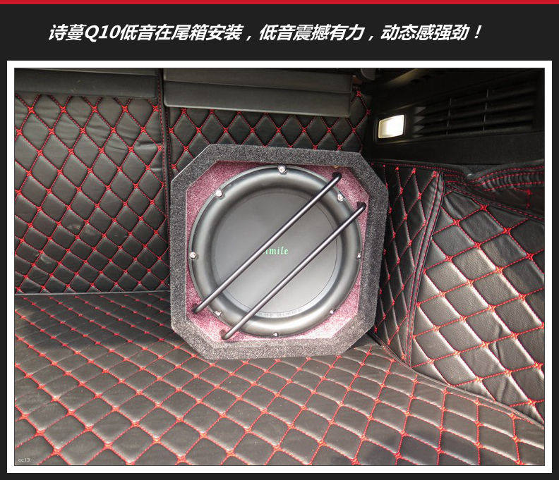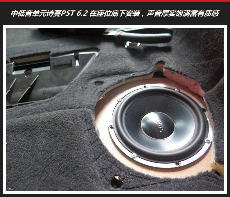 诗蔓中低音在前排座椅下方安装,左右两边各一个;升级之后,中低频更通透饱满,音乐效果更丰满立体。