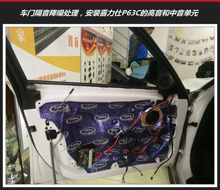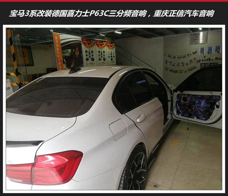 宝马3系汽车音响改装配置: 前声场:德国喜力士P63C三分频套装 DSP功放:D&M B6六声道蓝牙DSP功放 低音功放:诗蔓ST600.1单声道功放 低音:美国捷力W3 10寸低音 四门隔音:大能蓝金刚+大能超级温莎 改装店家:重庆正信汽车音响改装 方案解析: 宝马3系为三分频系统,对位升级一套音质更出色的德国喜力士P63C三分频套装喇叭,让高音更清脆、中音更甜润、中低频更厚实饱满。在尾箱倒模加装一只10寸的捷力低音,通过一台诗蔓ST600.1单声道功放推之,使得整体音效更丰满立体。D&M B6六声道蓝牙DSP功放搭配喜力士三分频,通过电脑调音使得声场定位更精准,声音效果更有层次感。 1、车门隔音降噪处理,对位安装喜力士P63C三分频套装的高和中音单元。