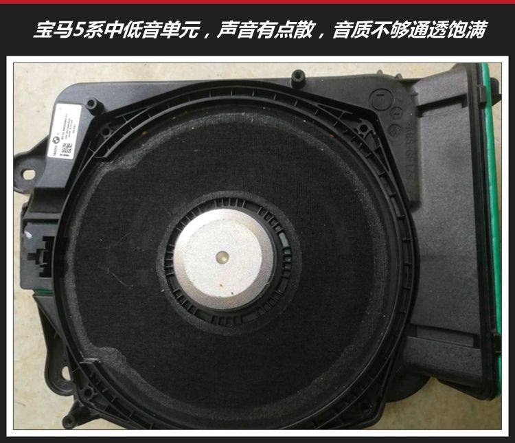 宝马5系原车配置的中低音单元位于座位底下,塑料纸盘结构,声音不够扎实,在此次升级过程中被诗蔓PST6.2D的中低音单元所取代。