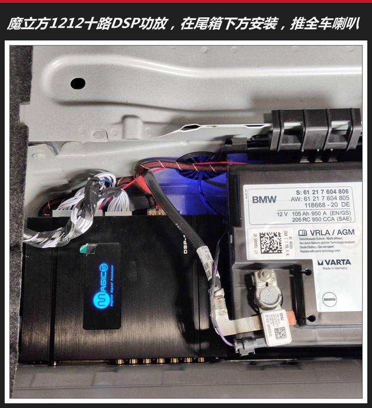 3、魔立方1212十路DSP功放在尾箱安装,它拥有8路50W输出,2路80W輸出,31段EQ调音功能,让宝马5系所有喇叭单元都能释放潜能,带来美妙的音乐体验。