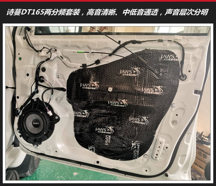 2、隔音之后安装喇叭,诗蔓DT165二分频喇叭,它包含2个高音、2个中低音以及2个分频器,都是对位安装,因此可以说是无损升级。这套喇叭性价比高,声音清晰悦耳,升级之后音质更有层次感。