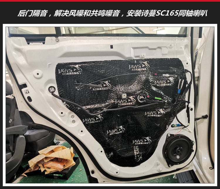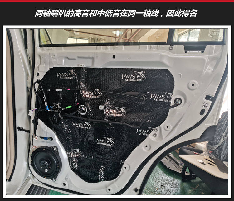 3、后门也做了隔音降噪处理,之后对位安装诗蔓SC165同轴喇叭,它的高音和中低音在同一轴线上,因此得名。同轴喇叭通常用作后门喇叭,它的价格一般来讲会比套装喇叭便宜,而且主机直推就可以了。