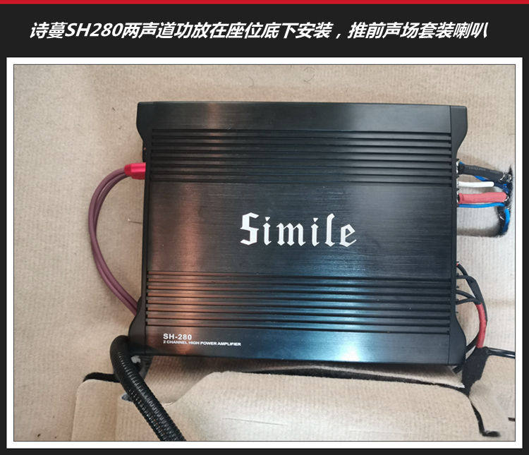 4、诗蔓SH280二路功放推前门的套装喇叭,我们把它安装在座位底下,因此可以节省一定的空间。线材处理方面也非常讲究,改装音响要找专业的汽车音响店来做。