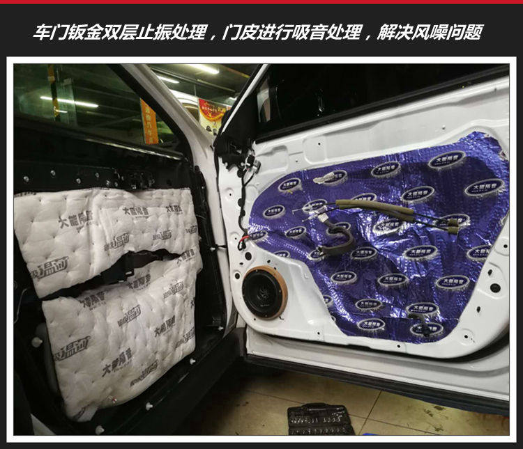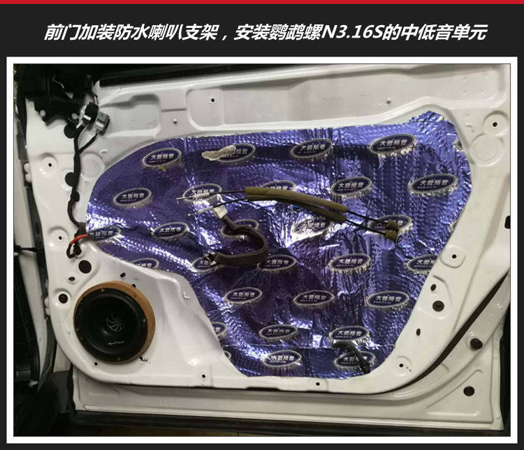 2、在安装喇叭之前,先对车门钣金进行双层隔音止振处理,提升钣金扎实度、减小钣金共振噪音,使得车门密封如同箱体,有利于提升喇叭音质效果。门皮上的吸音处理,让风噪在传播过程中被进一步减小。