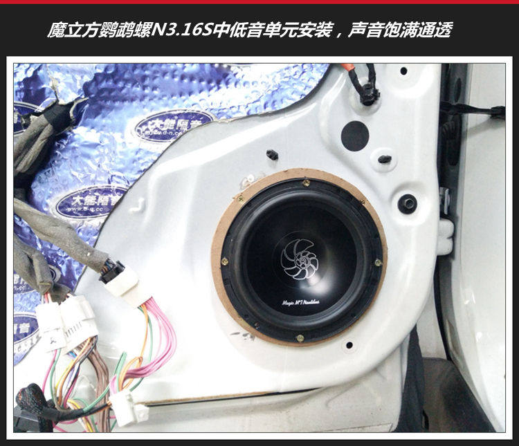 车门隔音处理,安装魔立方鹦鹉螺N3.16S两分频套装喇叭的中低音单元;喇叭线材焊接处理,加装防水支架固定中低音喇叭,在安装细节方面重庆正信的师傅们处理得非常细致。