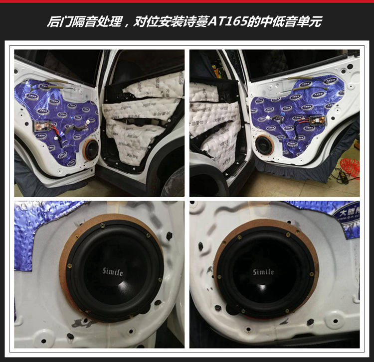 后门同样是车门钣金双层隔音止振处理,粘贴大能蓝金刚隔音止振材料阻隔钣金共振和噪音,门皮上也进行一层吸音处理。诗蔓AT165两分频套装的中低音则是对位安装。