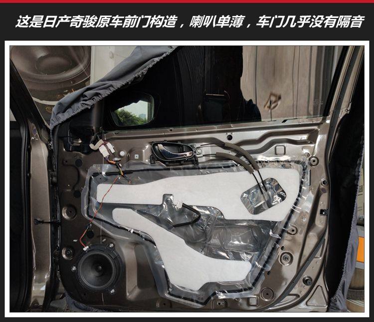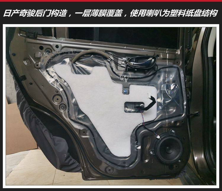 2、这是日产奇骏前门构造,喇叭非常普通:塑料纸盘结构;它的原车门隔音设施也非常少,在高速行驶的时候,风噪有点大。