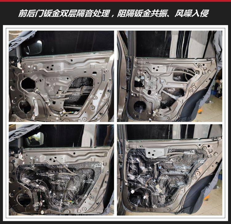 3、前后门的钣金进行双层隔音处理,提升钣金扎实度、阻隔钣金共振噪音,同时削减风噪入侵。