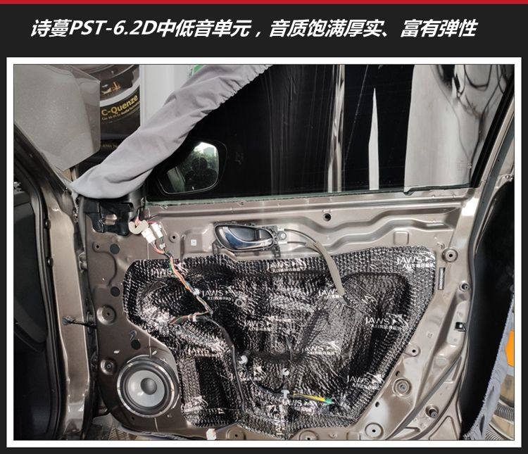前门更换诗蔓PST-6.2D两分频套装喇叭,它包含2个高音、2个中低音和2个分频器。PST-6.2的高音清晰纯美、中低频通透饱满、富有弹性,音乐得到非常真实的还原。后门更换一对诗蔓SC165同轴喇叭,为后排带来更清晰悦耳的聆听享受。尾箱加装一只10寸的诗蔓SD-102低音炮,低频非常震撼有力。