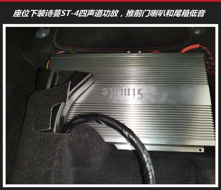 6、诗蔓ST-4四路功放在座位底下安装,占用空间少;它的功率输出充沛,推诗蔓喇叭音质曼妙。