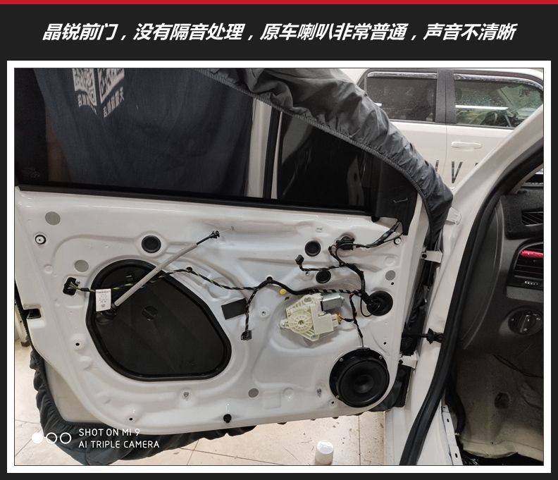 晶锐原车前后门都没有隔音处理,而且原车配置的喇叭非常单薄,声音不够清晰通透。